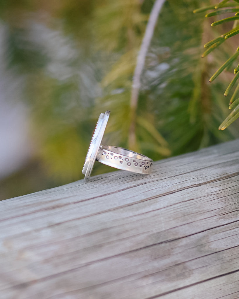 Size: 8.5 on top of a hand-stamped trout patterned band