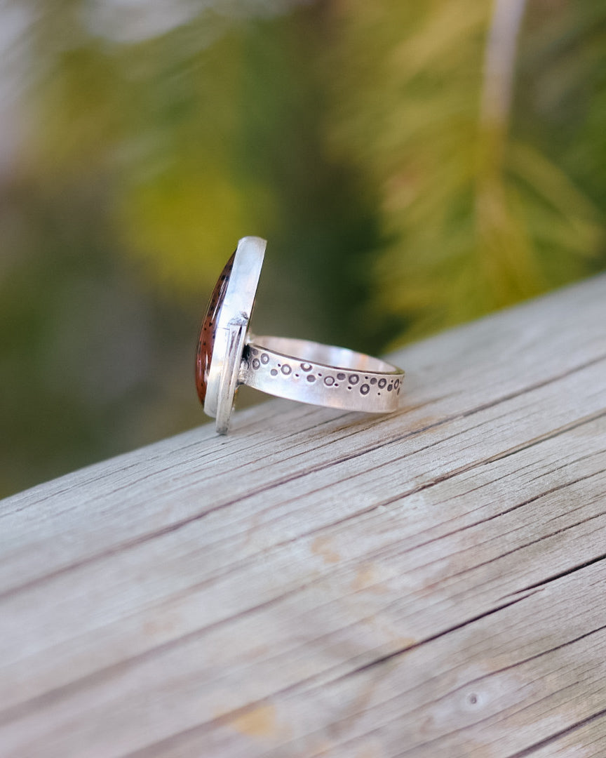 Size: 8.5 on top of a hand-stamped trout patterned band