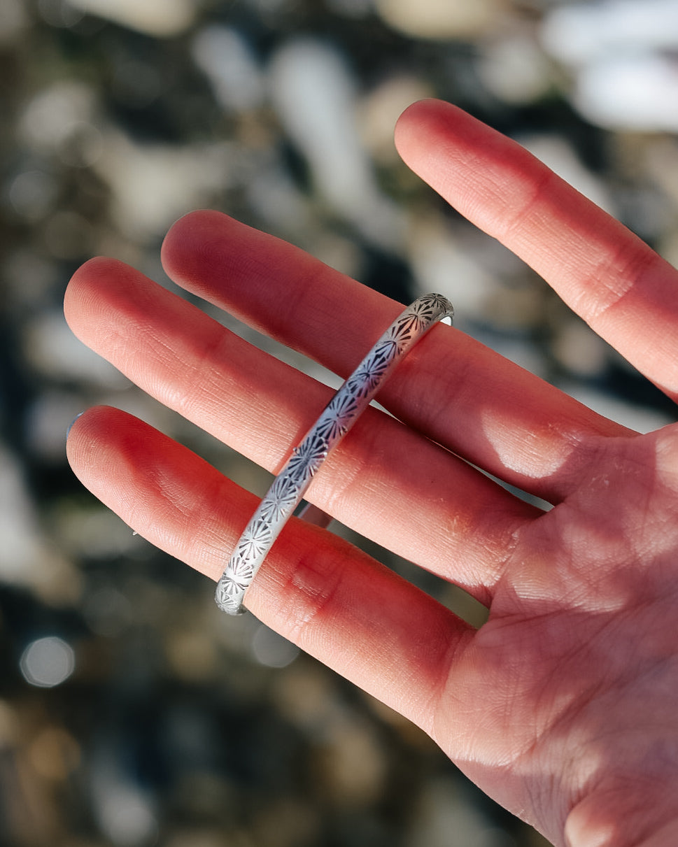 This thick-gauge sterling silver cuff features a hand-stamped sunrise design. Made to feel sturdy and grounding, this piece is perfect for everyday wear and built to last through all your adventures.
