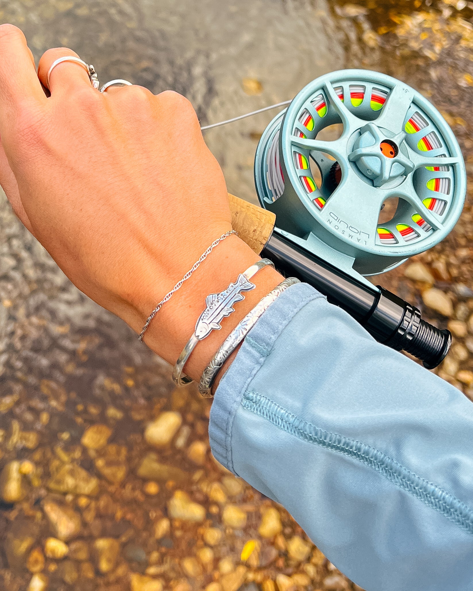 This sterling silver cuff features a hand-sawn trout, stamped with tiny details to bring it to life, straight from a sketch in my doodle book. A piece for trout lovers, river roamers, and anyone who wants to carry a little trouty magic with them. ;)